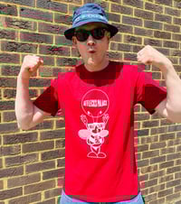 A unisex band tee from Afflecks, sporting the band bee mascot - Buzzington Levi in white; printed onto a red tee.